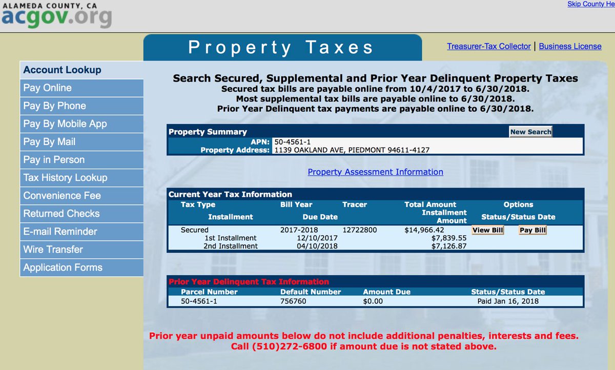 Alameda County Assessors Office 1221 Oak Street Room 145. Lookup or pay delinquent prior year taxes for or earlier.